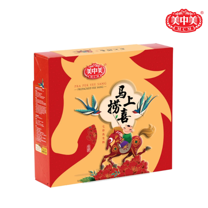 Welcome good fortune and success with MCM Pra Pek Yee Sang (马上榜喜 Edition) — a beautifully packed 360g prepacked Yee Sang that combines authentic festive flavor with a design symbolizing instant success and joy.